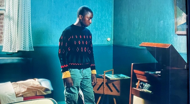 Marcel returns home to a record playing which is Statesboro Blues by Blind Willie McTell. We see Idrissa standing next to the record player, transfixed. The lyrics, which include the line “My daddy died and left me wild, wild, wild”, fill the space. Idrissa’s expression conveys a life already lived beyond his years. With Statesboro Blues still playing, the scene segues into Marcel and Idrissa, who is now in a yellow top, sitting outside together. They look content in each other’s company. It’s an ordinary moment but gently confirms Marcel as Idrissa’s temporary father figure. The simplicity of this scene, which captures their developing affection and resilience, is utterly sublime.