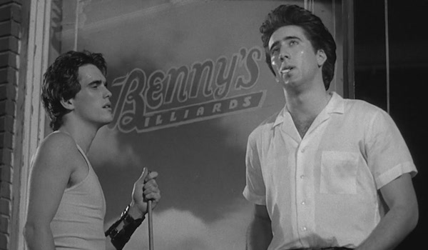 And so to Mr Cage. He plays Smokey, a key member in a gang led by Rusty James. We meet the gang at Benny’s Billiards (Benny is played by Tom Waits) when Midget (Lawrence Fishburne) enters and tells Rusty James that Biff Wilcox wants to fight him under a bridge that night. We get a sense of the characters very quickly here: Rusty James is laid-back and ready to go and Chris Penn’s B.J. is instantly game showing his loyalty and taste for violence. Smokey agrees but is reluctant. He seems keen on the fun side of gang life (such as hanging out in pool halls) but less so on the organised dust ups. The bookish Steve (Vincent Spano) is dead against it. He reminds Rusty James that his brother, known as The Motorcycle Kid (Mickey Rourke), would not approve. This is where we learn that The Motorcycle Kid has been gone for two months and no one has heard from him.
