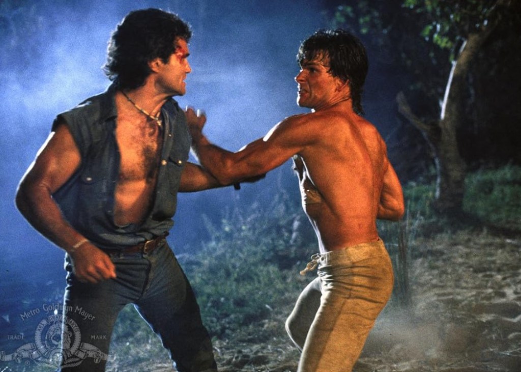 There’s an even better one! Dalton and Jimmy have an epic rumble after Emmett’s farmhouse is torched and after dragging the old farmer out, Dalton spots Jimmy cackling maniacally from his motorbike. Dalton knocks Jimmy from his bike and they face off next to the river – it’s Dalton in his tight, sack revealing trousers versus double denim Jimmy. That both actors are trained fighters shows and this scene was filmed over 4-5 nights with them repeating the scuffle 71 times. It’s great and looks as brutal as it sounds. It concludes with Chekov’s throat rip and Dalton throws Jimmy’s body in the river. Westley can only look on from the other side as the lifeless body of his one decent henchman floats by, Dalton bellowing “WESTLEY! FUCK YOU!” the whole time. I won’t lie, I was sad to see Jimmy go.