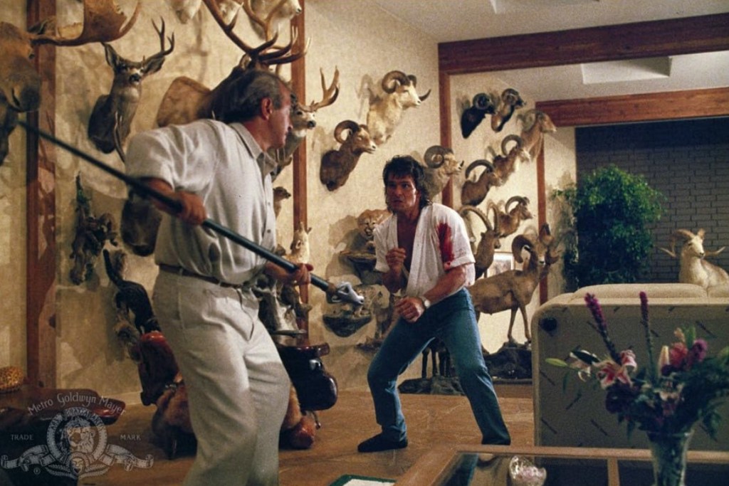 Luckily for Dalton they split up and take him on one at a time meaning he can easily dispatch them. The camera switches to a point of view shot here and it’s a bit weird, it reminded me of playing the Nintendo 64 game ‘Goldeneye’ if you could select ‘Rich Dude’s Hunting Lodge’ as a level. Westley eventually appears delivering the classic line “I see you found my trophy room, Dalton. All it needs is your ass”. They grapple and with Westley eventually overpowered, Dalton hovers over him, ready to deliver his special move. To show that he has learned something from Wade, Dalton holds back from the throat rip and lets him live. Hard to do I imagine when one is in the throat rip zone.